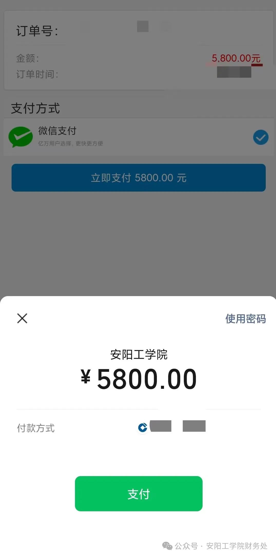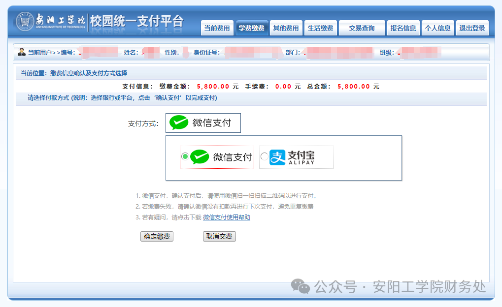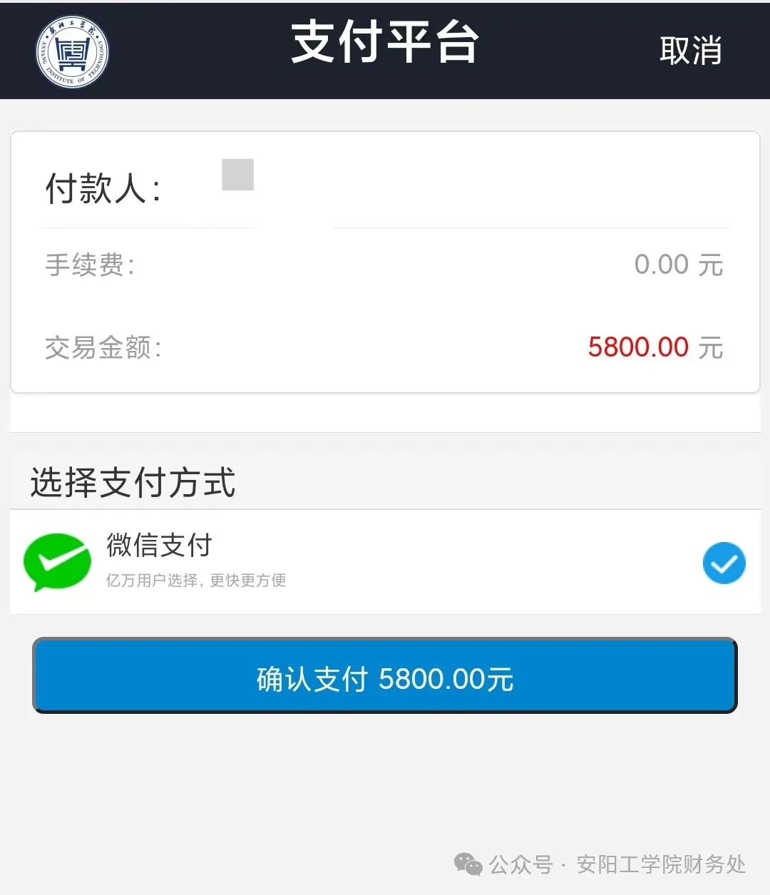 第六步:请确认收款方为“安阳工学院”,选择您的付款方式并点击“确认支付”按钮进入支付界面并完成支付。
