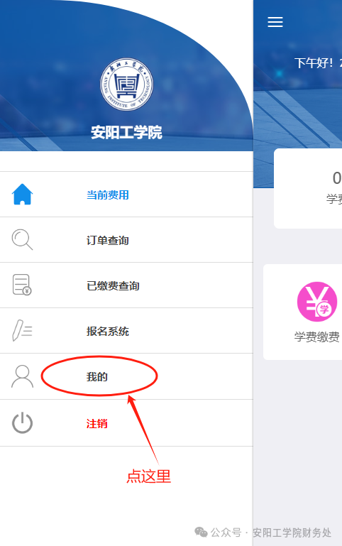 方法二:点击“安阳工学院财务处”微信公众号下方的“学生缴费”,输入用户名(学号)和密码(身份证号码后六位)登录,也可在登录界面选择证件号+姓名方式登录。