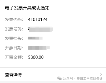 方法一:如果已在安阳工学院财务处微信公众号成功绑定学生信息,在缴费成功后,会收到安阳工学院财务处微信公众号发送的“电子发票开具成功通知”,如下图所示。