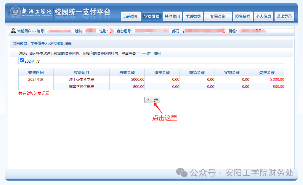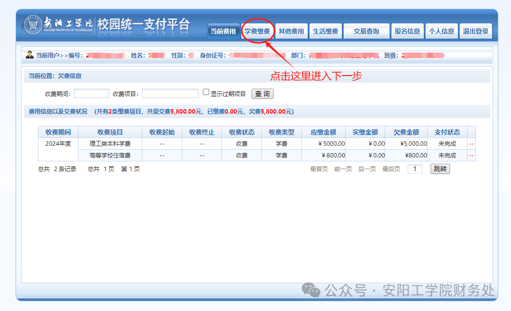 第二步:登录成功后进入如下界面,该界面中显示您需要缴纳的费用信息。